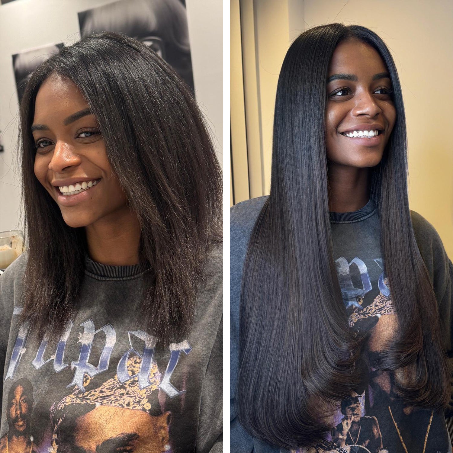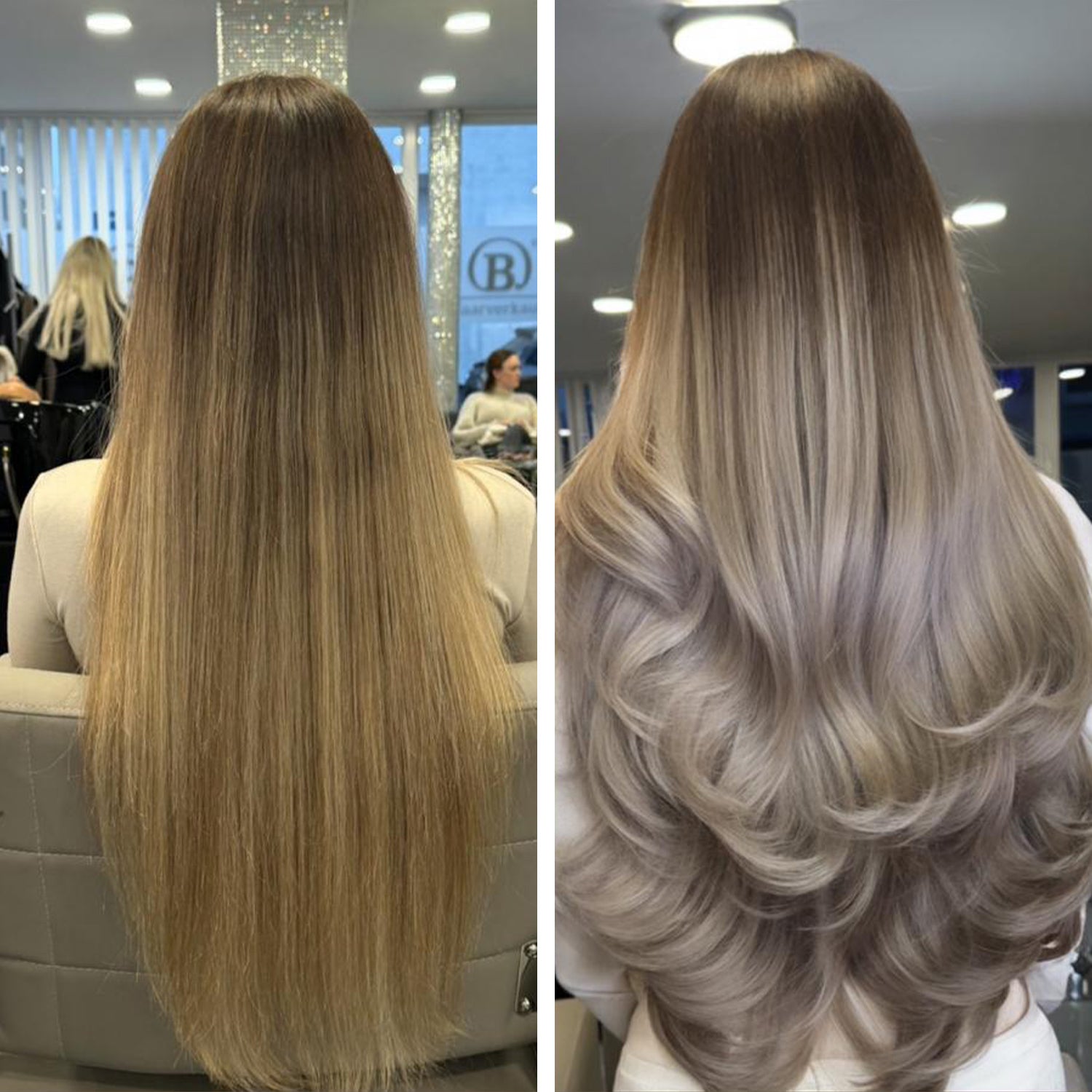 Eine Haarverdichtung erreicht man schon mit 50-75 Strähnen. Für eine komplette Haarverlängerung benötigt man bei normaler Eigenhaardichte 100-125 Strähnen, bei voluminösem Eigenhaar - ca. 150-200 Strähnen.